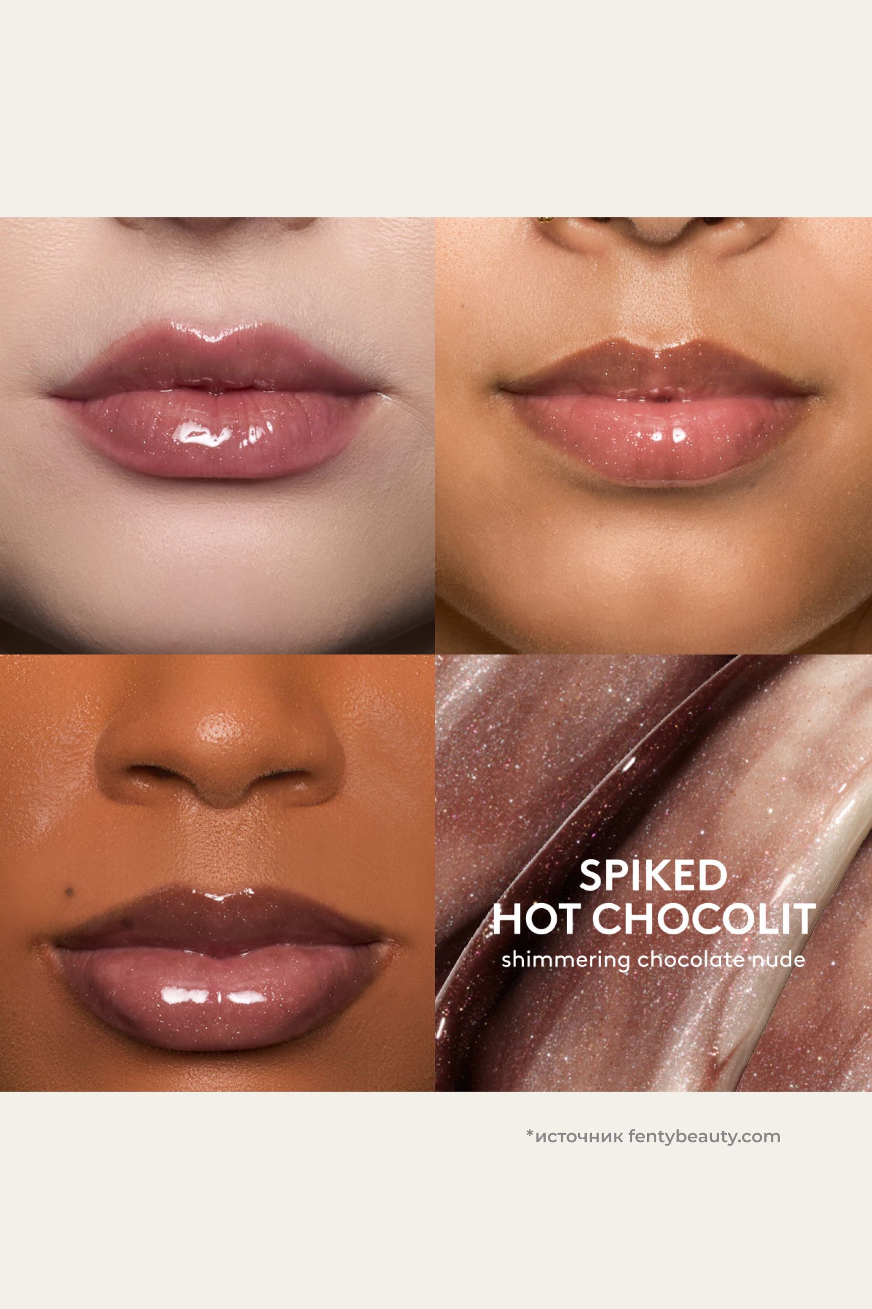 Spiked Hot Chocolit — три оттенка от нежного бежевого до насыщенного коричневого, которые в сочетании друг с другом создают мерцающий шоколадно‑перламутровый цвет на губах.