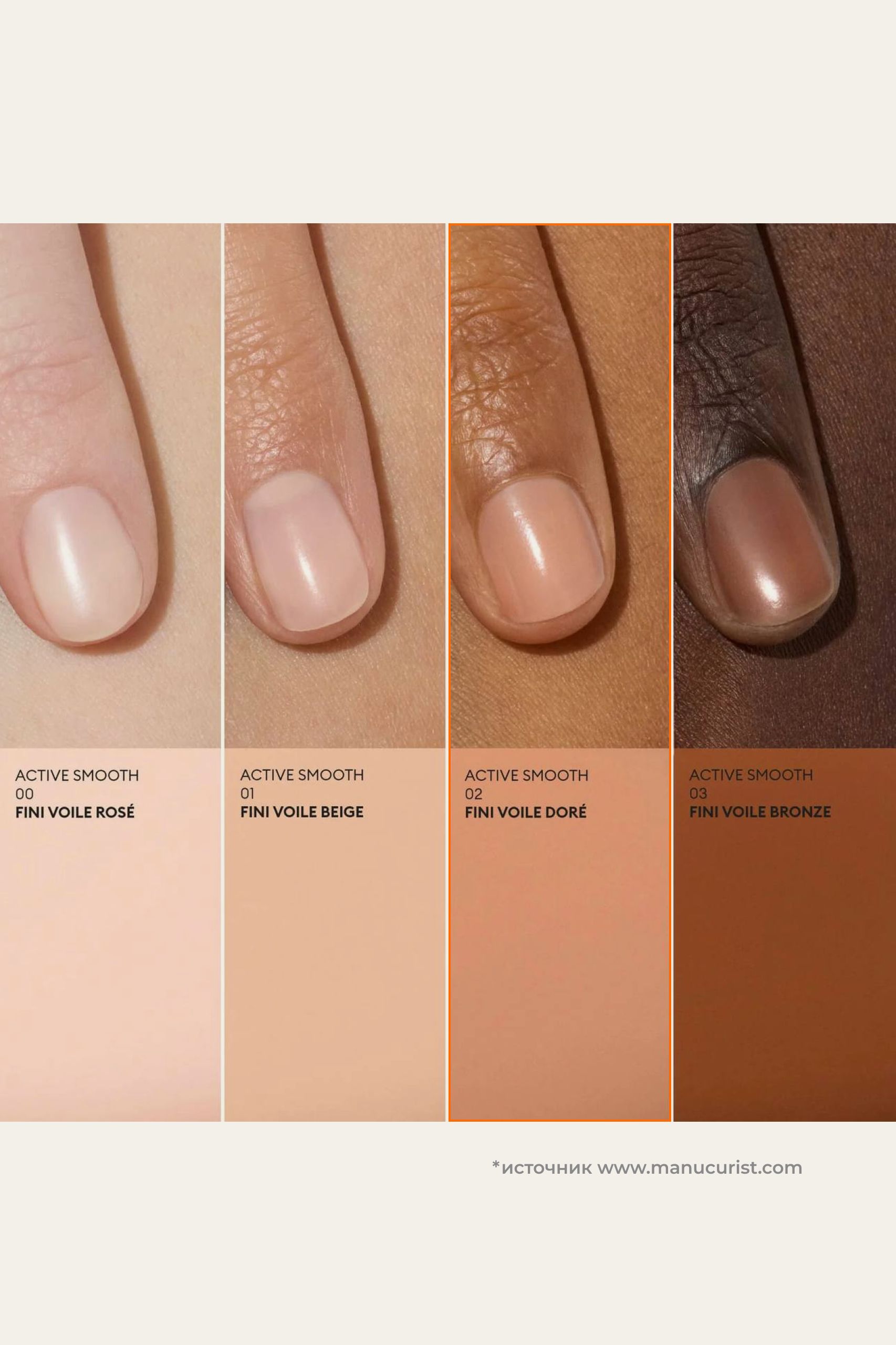 02 — нежный бежевый с тёплым золотистым подтоном и сатиновым финишем.